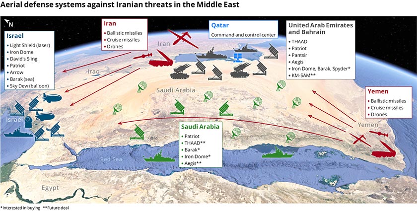 Между тем, 12 июля, посол Бахрейна в Израиле Халед аль-Джалахме посетил офисы оборонного концерна «Эльбит Маарахот», одного из трех крупнейших в Израиле. После посещения он сообщил, что на нём рассматривались возможности сотрудничества. См. Карту: Израиль планирует создать масштабное сотрудничестве с арабскими странами против «угрозы» от Ирана, Aereal_defense.