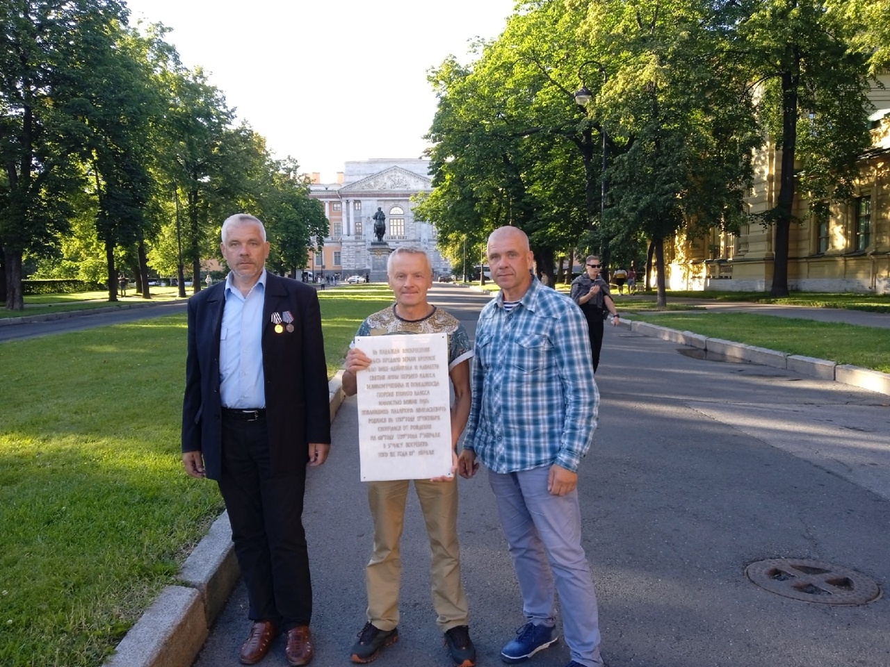 После исторического фестиваля 18 июля в Санкт-Петербурге депутат Сиверского городского поселения Гатчинского муниципального района Ленинградской области Комар Анатолий Васильевич передал нам уже готовую мраморную плиту недалеко от Михайловского замка. Плита с историческим текстом в тринадцать строк, высота плиты 55 сантиметров, ширина составляет тридцать пять сантиметров, толщина мраморной плиты три сантиметра. Братья Буховецкие с благоговением увозят мраморную плиту в Беларусию.