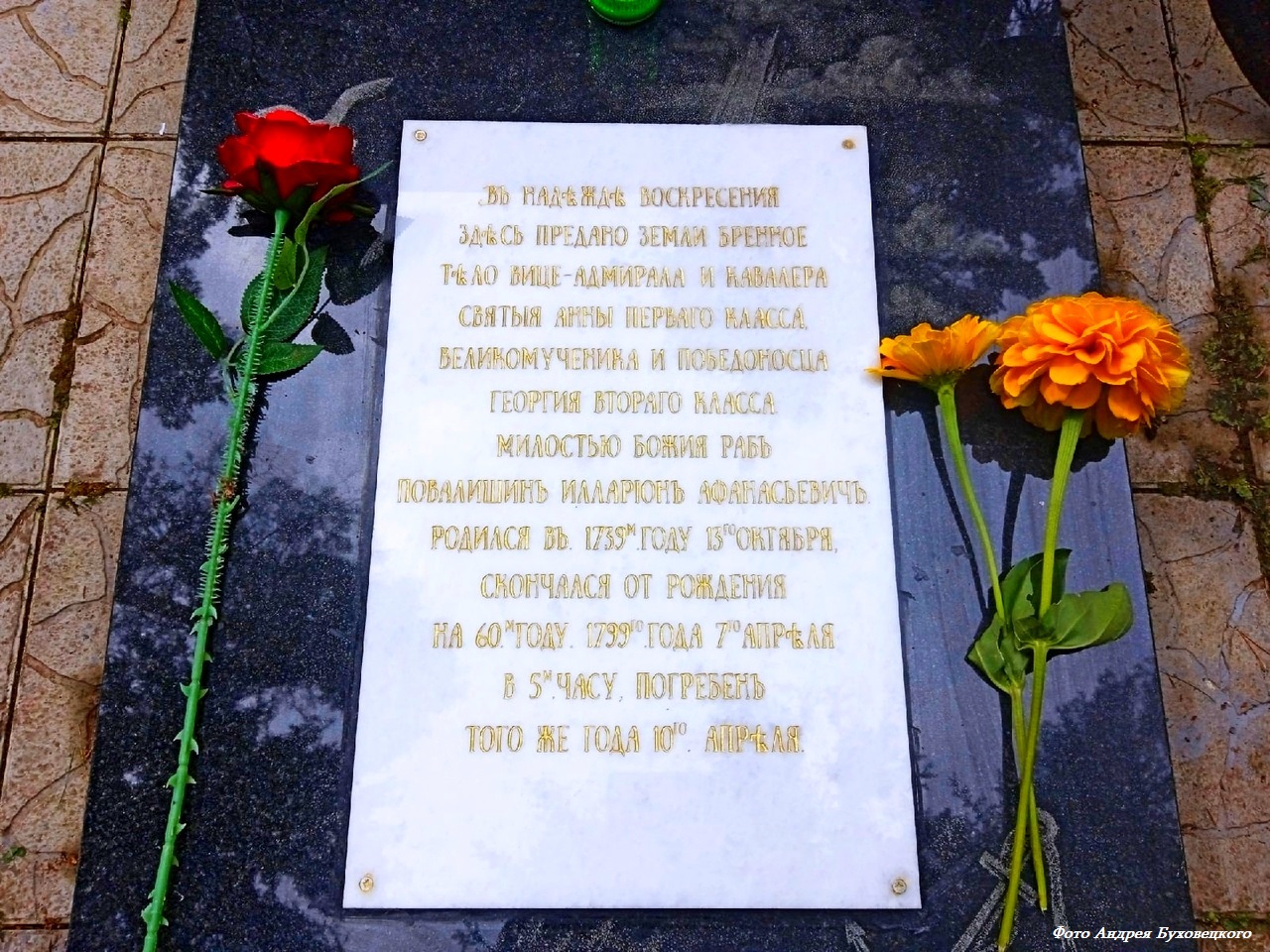 У Андрея Буховецкого возникла идея воссоздать утраченную разбитую надгробную мраморную плиту конца XVIII века – вице-адмирала Иллариона Афанасьевича Повалишина, которая была уничтожена в тридцатые годы прошлого века. Этой идеей я поделился со своим братом Алексеем, он поддержал меня.