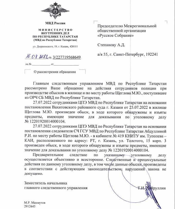 Письмо пришло от МВД по Республике Татарстан. То есть, Русское Собрание обжалует, направляя обращение министру Колокольцеву, дерзкие и не умещающиеся в рамки здравого смысла действия татарских силовиков, а ответ приходит от самих лиходеев. Почему Обращение Русского Собрания было «расписано» в структурах МВД не, например, в ГУ собственной безопасности МВД, а отправлено туда же – в Татарстан? Не по причине ли трогательной круговой поруки в структурах внутренних дел, даже по делам вопиющим, из которых явно торчат уши, скажу мягко, явных злоупотреблений?