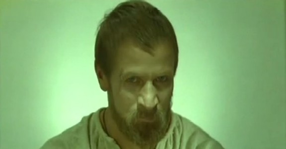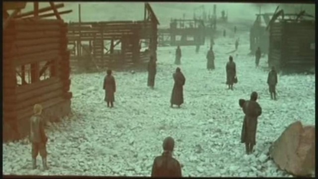 Пароксизм отчаяния последовал как внутренний взрыв. В сцене нет истерики, экспрессивного внешнего выражения, как это присуще героям Тарковского. Просто, сдавленный рык смертельно раненого зверя. Феодосий пал на колени, вжался лицом в холодный снег, и опалённый этим холодом, поднявшись, побежал в белую крутящуюся мглу. Он бежит, падает, и, восстав, снова бежит. Вдруг, Феодосий замер. Он находит платок Евфимии, своей дочери. Красное на белом. Феодосий поднимает платок, и видит, как из той же мглы вышла Люба Гремякина с сыном. Они единственные, кто спасся от расстрела. И, снова – черное на белом.