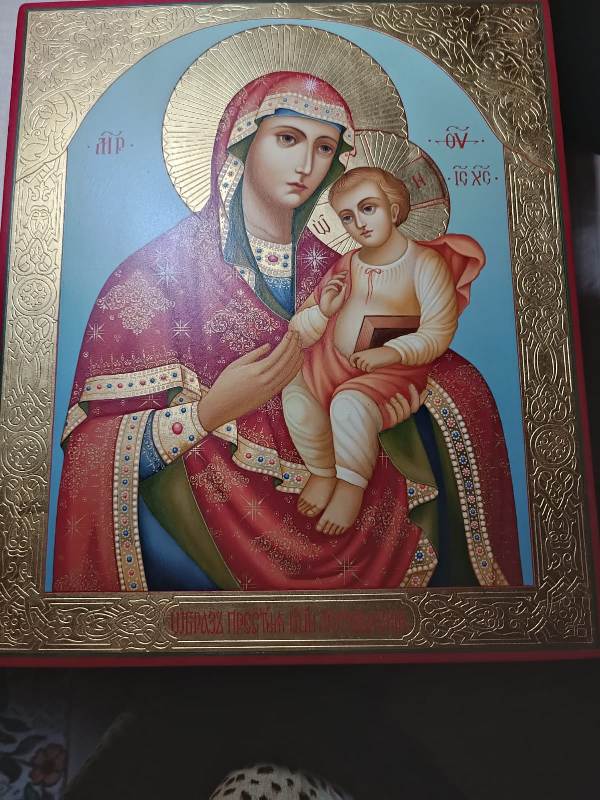 И ещё, совсем недавно, мне прислали фотки, где ему мстерский иконописец дарит Песчанскую икону Божией Матери. Ту самую, с которой он ходил Крестным ходом году этак в 2017 по «местам соприкосновения» с такими же, как он, ополченцами. Та, первая икона, была простая, бумажная, ламинированная, а эта - писаная, с золотом.