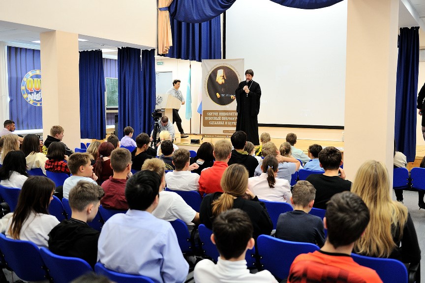 В течение нескольких месяцев мы проводим различные мероприятия, в том числе встречи с молодежью: школьниками, учащимися средних и высших учебных заведений. Эти встречи проходят в разных населенных пунктах области. Серия подобных встреч состоялась на днях в Курильском районе – самом дальнем уголке нашего региона. Мы приезжаем туда уже не в первый раз. С администрацией района и с районным отделом образования у нас давно сложились добрые, рабочие отношения», - сказал отец Виктор.