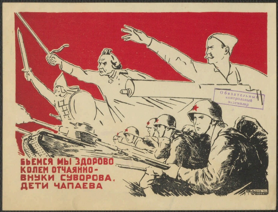 Электронная репродукция плаката «Бьемся мы здорово, колем отчаянно - внуки Суворова, дети Чапаева», 1941 год. Из фондов Президентской библиотеки.