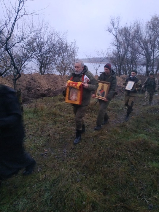Молебен и крестный ход вдоль боевых позиций. По размытой дождями глиняной дороге поехали на передовую к нашим воинам, которые капают вручную окопы в полный рост. Ребята, занимающиеся укреплением окопов, с радостью нас встретили. Был небольшой туман над Днепром. Мы встали на небольшой полянке, прикрываемой редкими деревьями. Достали из сумок иконы.