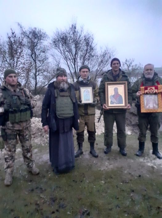 Икону святого воина Федора Ушакова дали держать одному из бойцов. Чудотворная икона Святого Царя-Мученика и Страстотерпца Николая Второго была у меня в руках. Список иконы Божией Матери «Песчанской», подаренный батюшке Макрию, Изюмским владыкой, дали держать другому бойцу. Отец Макарий подробно рассказал об иконах, с которыми мы приехали, об их месте в истории бывшей и нынешней России. Я рассказал о чудотворениях Царской иконы, которую привезли на фронт и великом смысле ее пребывания на боевых позициях совместно с «Песчанской» иконой. После выступлений начали служить молебен, потом батюшка совершил помазывание миром от мироточивых икон. Мы привезли в подарок много бумажных иконок. Бойцы выбирали, те которые им больше приглянутся. Также мы раздавали новые красивые медные крестики всем желающим. Потом раздали молитвословы, специально напечатанные для православных воинов, православную литератур, которые привезли с собой. Особенно полезной была книжка о. Германа о духах злобы поднебесных, т.к. мы воочию увидели какая духовная брань идет в прифронтовой полосе, и только вооружившись духовным оружием молитвой можно победить в этой брани.