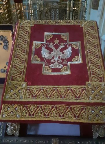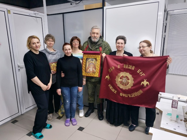 Новое царское облачение. Одна моя давняя знакомая, с детства почитавшая Святого Царя Великомученика и Страстотерпца Николая Второго, увидев изношенную сумку, в который переносилась чудотворная икона Святого Царя, предложила для поддержки нашей Миссии заказать новую сумку. Я стал искать, кто бы мог это сделать. Позвонил во многие компании, которые занимались церковным шитьём. У всех были разные сроки, разные варианты шитья, разные цены. В результате процесс затянулся более чем на полгода. После первой поездки на боевые позиции, с Божьей помощью нашли мастерскую «Церковные ткани» на Варшавском шоссе. С хозяйкой мастерской Еленой Лукашевой мы, оказывается, встречались в 1998 г. в Храме Вознесения Господня, в самом начале мироточения Чудотворной иконы. Она попросила прислать размеры сумки и пожелания по вышивке. В письме я добавил фотографии посещения иконой боевых позиций на Донбассе. При новой встрече она очень трогательно меня встретила. Сказала, что мы с радостью изготовим сумку для иконы, поддерживающей наших воинов. В результате дружный коллектив благотворительно подарил ещё вышитое знамя для ЧВК «Вагнера» и изготавливаемые мастерской предметы церковной утвари для треб воинских священников. Слава Богу, что есть еще такие сердечные люди, которые всей душой болеют за любимую Матушку-Русь и за её детей!
