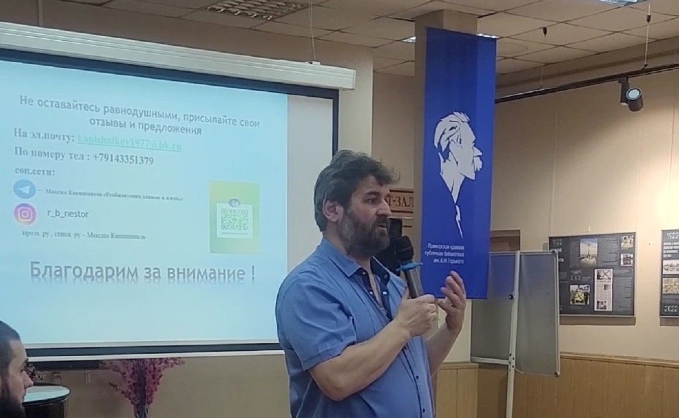 11 декабря в Приморской краевой публичной библиотеке имени А.М. Горького, что в городе Владивостоке, общественность знакомили с книгой-исповедью, раскрывающей тайные и явные смыслы, предпосылки, последствия выбора и всю сложность личного противостояния с одной из наиболее актуальных проблем современной России – химической зависимостью, от алкоголя и наркотиков. Автор книги «Реабилитация длиною в жизнь» – Максим Капишников. Ранее экспериментировал с поэтической рифмой. Закончил катехизаторские курсы в Приморской епархии, с 2016 по 2022 год являлся руководителем подворья Душепопечительского центра реабилитации в честь святого праведного Иоанна Кронштадтского.