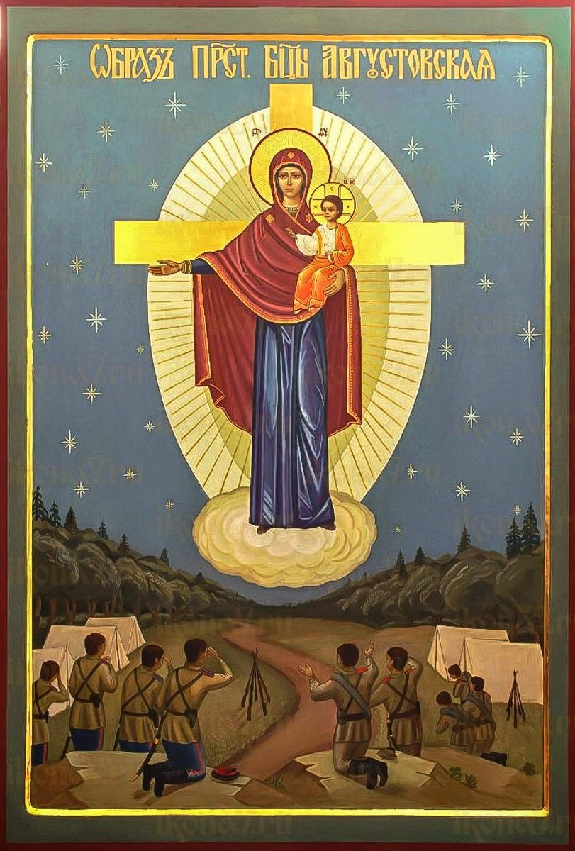 Известно, что в начале войны было массовое явление Матери Божией русской армии в лесу под Августовом в ночь с 13 на 14 сентября (н.ст.) 1914 года, перед удачно завершившейся для нас Варшавско-Ивангородской операцией. Вот как это чудо описал один из очевидцев, кирасир Ея Величества — обозный Димитрий Серегин: «Я стоял на часах. Посмотревши на звездное небо, я увидел особенно яркую звезду, которою я долго любовался. Потом (это было часов в 11 ночи или немного позже) я увидел, что вокруг этой звезды появился круг из сияющих звезд, а самая первая (средняя) звезда начала темнеть, и на месте ее стал вырисовываться образ Божией Матери с Младенцем Иисусом Христом на левой руке, а правая [рука] была немного вытянута, и мне казалось, что Она нас ею будто благословляла. Божия Матерь смотрела в направлении города Мариамполя. Вокруг головы Божией Матери было яркое сияние. Было ли сияние вокруг всей фигуры Божией Матери, он не помнит, но думает, что было. Изображение Божией Матери было видно до пояса, а остальные части тела ниже пояса были закрыты облаками, (но обозначались). Лик у Божией Матери был спокойный, не строгий, а скорее ласковый. Изображение мне казалось похожим на икону Ченстоховской Божией Матери. Явление это я видел очень отчетливо и ясно, продолжалось оно минут 10 или 15. Был им очень поражен. Потом побежал сообщить об этом своим товарищам. Когда возвратился и опять начал смотреть, то видение это уже очень изменилось: оно было то же самое, но только уже бледное слабо заметное, постепенно превратившееся в светлое пятно. На фоне этого пятна можно было заметить (не очень ясно и недолго) изображение креста, как бы из облаков (это представляю себе не отчетливо). На месте этого видения после светлого пятна опять засияла та же яркая звезда. Видели это и другие солдаты, бывшие от меня в удалении». Этот факт, хоть и почти 2 года спустя (!) был признан Синодом, хотя сама соответствующая икона «Августовская» была написана ранее и выпущенная массовым тиражом.