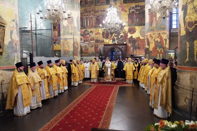 Будем молиться святителю Петру и о граде Москве, чтобы молитвы святителя достигли престола Божия и град наш сохранялся в мире и духовной силе, чтобы правители наши сохраняли мудрость и веру православную, чтобы народ наш, объединенный вокруг града Москвы, сохранял единство не только политическое, — потому что политические схемы приходят и уходят, — а то духовное единство, которое связывает всех нас с Кремлем и этим Успенским собором, кафедральным собором всея Руси. И да будет так! Будем об этом просить Господа и святителя Петра, митрополита Киевского, Московского и всея Руси, чудотворца, и его молитвами да приклонит Господь милость Свою к Отечеству нашему, народу нашему и Церкви нашей. Аминь», — завершил Святейший Патриарх Кирилл.