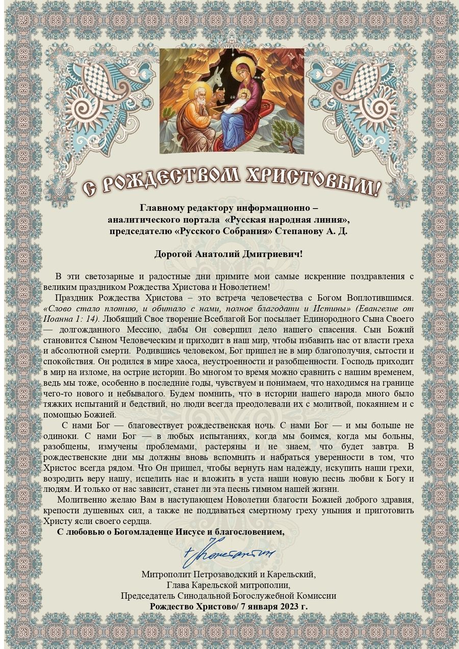 В канун Рождества Христова на имя главного редактора информационно-аналитического портала «Русская народная линия», председателя «Русского Собрания» А.Д. Степанова поступило поздравление от митрополита Петрозаводского и Карельского Константина (Горянова). Публикуя поздравление Владыки, считаем, что его напутствие будет полезным для всех наших читателей.