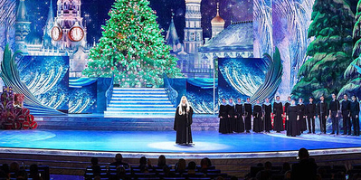 На центральной сцене Кремлевского дворца прозвучал тропарь Рождества Христова (музыка А. Лядова) в исполнении Сводного добровольческого молодежного хора Западного викариатства Московской епархии (регент Мария Якиманская).