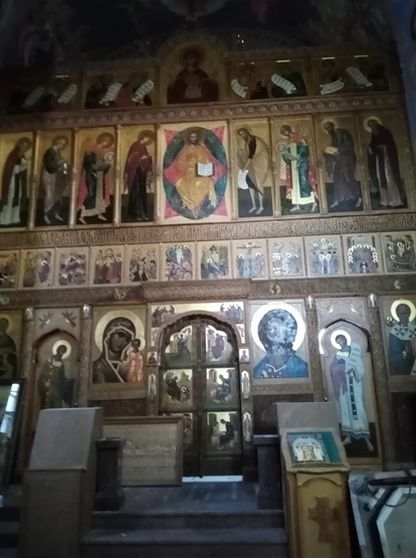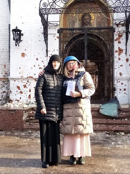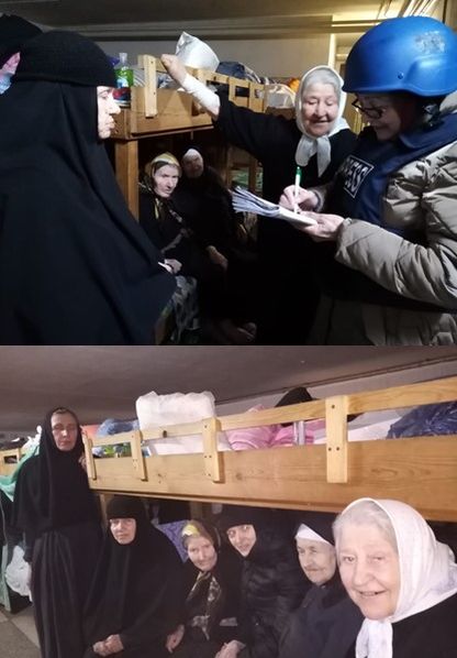 Верхняя часть храма полностью разрушена. В нижнем подземном храме нас ожидают сестричество и братство. Нас встречают с любовью, некоторые даже плачут от счастья. Мы разобнимались и подарили икону Пресвятой Богородицы, а также передали купленные тёплые зимние вещи, куртки, бельё и лекарства для сестёр и монахов.