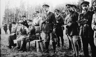 На фото: адмирал А. В. Колчак (сидит), глава британской миссии генерал А. Нокс и английские офицеры на восточном фронте, 1918 г.