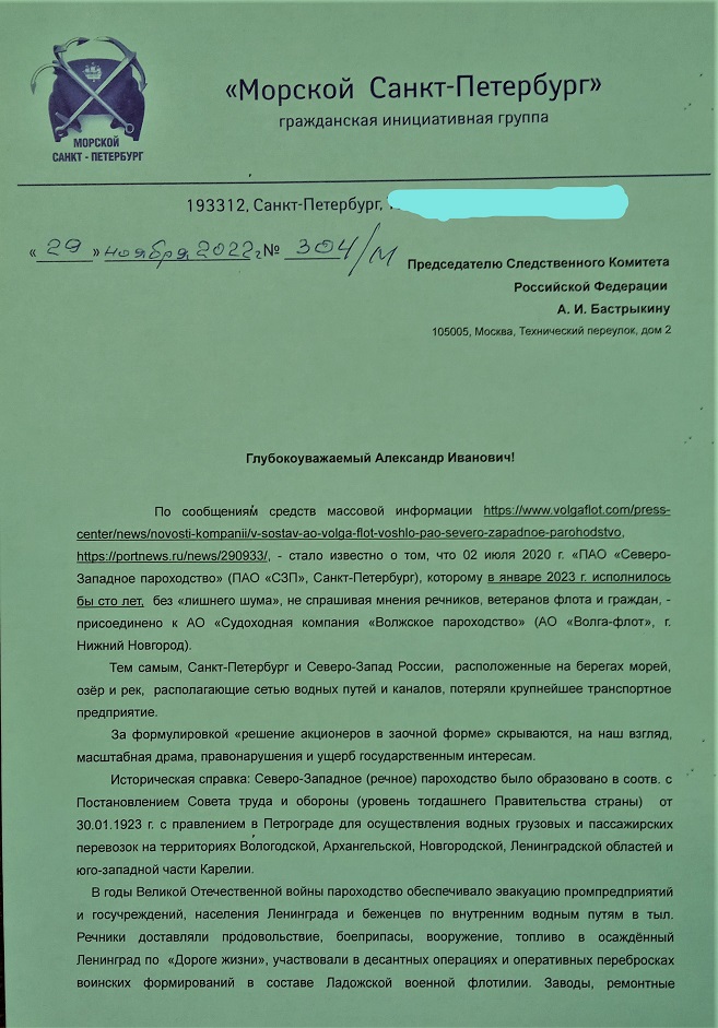 «Глубокоуважаемый Александр Иванович! По сообщениям средств массовой информации: ссылка 1, ссылка 2, стало известно о том, что 02 июля 2020 г. «ПАО "Северо-Западное пароходство" (ПАО "СЗП", Санкт-Петербург), которому в январе 2023 г. исполнилось бы сто лет, без "лишнего шума", не спрашивая мнения речников, ветеранов флота и граждан, - присоединено к АО "Судоходная компания "Волжское пароходство"" (АО "Волга-флот", г. Нижний Новгород). Тем самым, Санкт-Петербург и Северо-Запад России, расположенные на берегах морей, озёр и рек, располагающие сетью водных путей и каналов, потеряли крупнейшее транспортное предприятие», - говорится в поступившем в редакцию РНЛ письме на имя председателя Следственного комитета России Александра Бастрыкина от ветеранов-моряков.