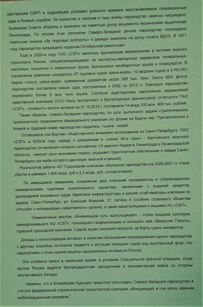 В документе говорится о том, что оставшееся «за бортом» общественного внимания исчезновение из Санкт-Петербурга ПАО «СЗП» в 2020-м году, наряду с разорением в «лихие 90-е годы» - Балтийского морского пароходства (отчисления которого составляли 1/3 единого бюджета Ленинграда и Ленинградской области), наносят урон экономике страны, ухудшают транспортное обеспечение и имидж Санкт-Петербурга (на гербе которого два якоря: морской и речной).
