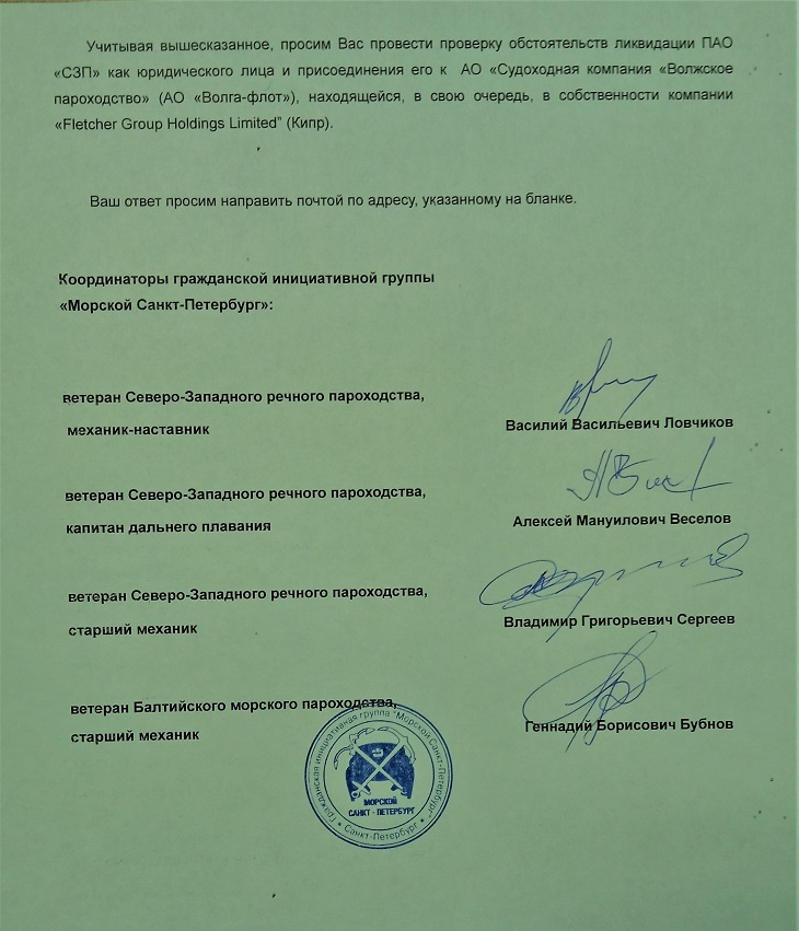Документ подписали координаторы гражданской инициативной группы «Морской Санкт-Петербург»: ветеран Северо-Западного речного пароходства, механик-наставник Василий Васильевич Ловчиков, ветеран Северо-Западного речного пароходства, капитан дальнего плавания Алексей Мануилович Веселов, ветеран Северо-Западного речного пароходства, старший механик Владимир Григорьевич Сергеев, ветеран Балтийского морского пароходства, старший механик Геннадий Борисович Бубнов.