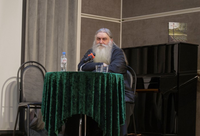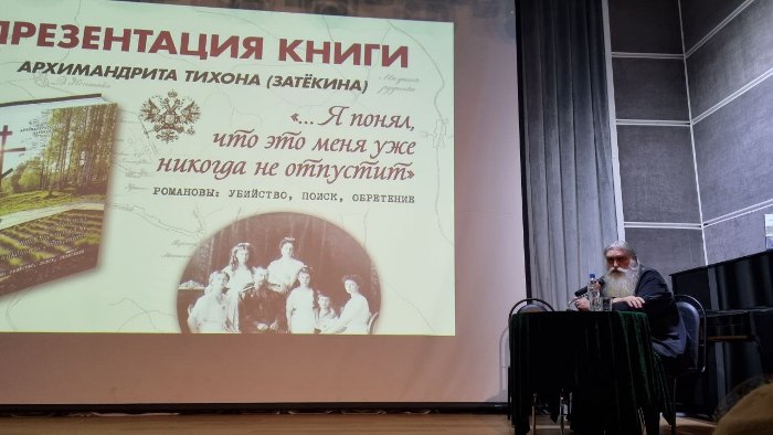 Затем выступил член Союза писателей России, член Всемирного Народного Русского Собора, архимандрит Тихон (Затёкин), автор книги «"…Я понял, что это меня уже никогда не отпустит". Романовы: убийство, поиск, обретение». Сопровождая свою речь презентацией фотографий на экране, он рассказал, как еще во времена существования СССР стал заниматься этой, тогда абсолютно запрещённой, темой, как познакомился с замечательным писателем Гелием Рябовым и Александром Авдониным, в советские годы одними из главных инициаторов нахождения останков Царской семьи в Поросенковом логу под г. Свердловском в 1979 году. Абсолютно неожиданным для собравшихся было сообщение об интересе к истории убийства Царской семьи министра внутренних дел СССР Н.А.Щёлокова. Ярко, увлеченно архимандрит Тихон рассказывал о людях, которые, несмотря ни на что, не оставляли работу по выяснению обстоятельств убийства Царского семейства и их слуг, и о том, какую огромную роль сыграла в расследовании Русская Православная Церковь.