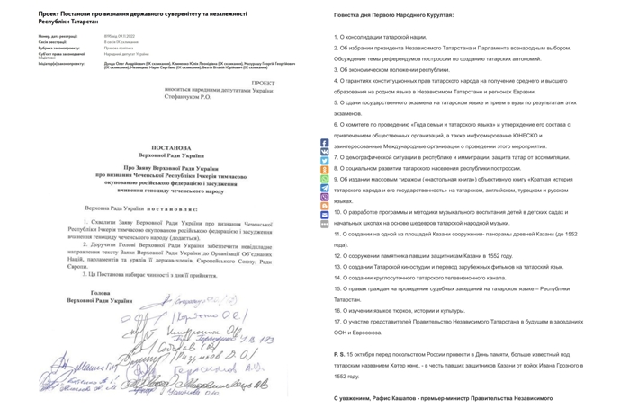 18 октября 2022 года Верховная Рада Украины большинством голосов признала независимость «Чеченской Республики Ичкерия». Вскоре после этого, 9 ноября верховная Рада Украины вынесла на рассмотрение проект постановления о признании государственного суверенитета и независимости Республики Татарстан. Инициаторами выступили пять депутатов – Дунда Олег, Клименко Юлия, Мазураш Георгий, Мезенцева Мария, Безгин Виталий.