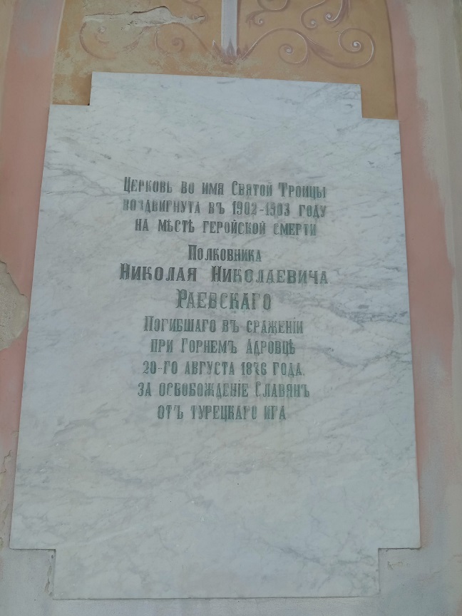 Церковь на месте гибели полковника Раевского была воздвигнута стараниями его семьи и потомков, в народе она известна как «красочный храм» или «русская церковь». Согласно преданию, любимому в нашей округе, Лев Толстой писал образ Алексея Вронского, героя своего романа «Анна Каренина», именно с полковника Раевского. Герой Освободительной войны послужил великому писателю прототипом.