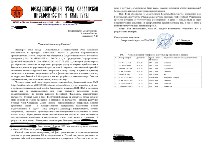 Одновременно на его телефон в разное время от неустановленных лиц стали поступать телефонные звонки предположительно из некоторых регионов Российской Федерации и соседствующих государств Средней Азии от лиц, голоса которых были похожи на голоса уроженцев и выходцев из государств – республик Средней Азии. В поступавших телефонных звонках в адрес А.В. Бочкарева звучали оскорбления, связанные с упомянутыми выше обращениями и заявлениями нашего Фонда. Через данные телефонные звонки на Генерального директора Общественного Международного Фонда славянской письменности и культуры оказывалось психологическое воздействие, звучали недвусмысленные угрозы его жизни и здоровью.
