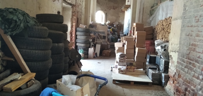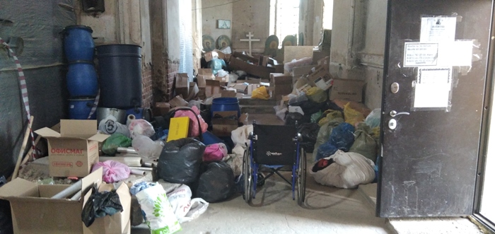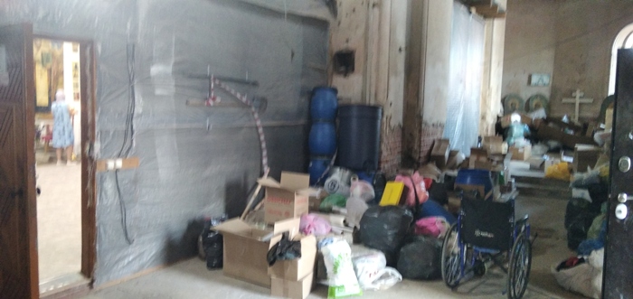 Кроме запаса дров в храме даже после отправки гуманитарки на Донбасс и возвращения о. Виталия – масса заготовленных к отправке туда вещей – и сменные автомобильные колёса, и сваренные буржуйки – как же они будут кстати нашим ребятам уже в дождливом сентябре – он наступит, не успеем глазом моргнуть. И инвалидные коляски.