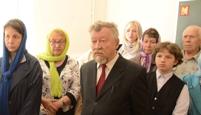 Николай Детков с прихожанами Тихвинского храма на открытии мемориала Максима Трошина в Духовно-просветительском центре имени благоверного князя Олега Брянского