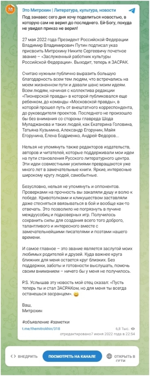 Так что является ли Митрохин ЗАСРАКом, конкретный такой термин из митрохинского телеграмм-канала, или нет, пусть судят читатели. Для себя автор статьи решение принял, звание Заслуженный работник культуры РФ Митрохину не присваивалось. На это подталкивает и тот факт, что нигде Митрохин не представил фото соответствующего нагрудного знака и удостоверения. Его фото с названными регалиями также в интернете отсутствуют. А он, видимо, любитель пафосных титулов и не пренебрегает покрасоваться перед публикой.