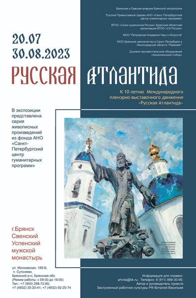 По благословению Высокопреосвященнейшего Александра (Агрикова), митрополита Брянского и Севского 20 июля 2023 г. в Брянской епархии начинает свою работу 112-й арт-марафон Международного пленэрно-выставочного проекта #РусскаяАтлантида-23. При первых же анонсах конкурса на участие в проекте заявилось немалое количество хороших художников из самых разных городов России. Впоследствии были выбраны лучшие заявки и сформирована достаточно большая пленэрная бригада, в которую вошли три живописца из Москвы – Рыжова Мария, Русакова Юлия и уроженец Брянщины Пауков Дмитрий, три художника из Петербурга – Гончаренко Ольга, Новикова Светлана и Трошин Виталий, Сахарова Виктория (Великий Новгород), Харченко Виктория (Калуга), Фролова Нелли (Воронеж), Рыженко Владимир (Петушки), Сайко Владимир (Минск) и семь жителей Брянска – Борисенко Николай, Орешкина Ольга, Хомрачёв Александр, Чмыхова Елена, Лагутина Екатерина, Миронова Тамара, а также давний наш партнёр по пленэрно-выставочной работе Целобанова Елена.
