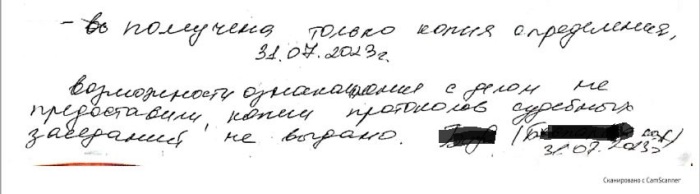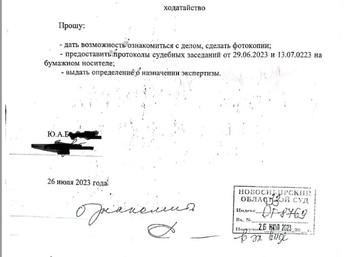 Торопливым голосом зачитанное апелляционное определение вызвало вопросы, на которые не было ответов. Поэтому Юлия, спустя две недели, обратилась в суд с ходатайством о предоставлении ей возможности ознакомиться с материалами дела и протоколами судебных заседаний, прошедших 29 июня и 13 июля, а также выдать определение о назначении экспертизы. В тот же день, 26 июля, на ее ходатайстве появилась резолюция «Ознакомить», скреплённая квадратной печатью и подписью.