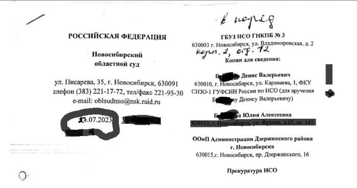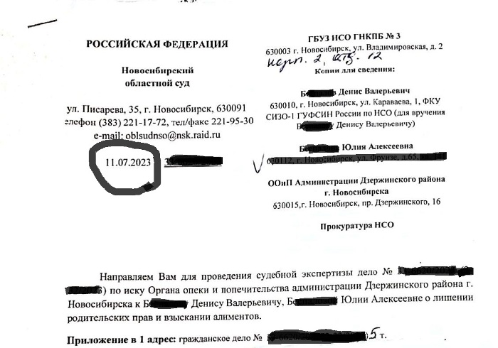 Наконец, 31 июля ей вручили копию определения с сопроводительным письмом в ГБУЗ НСО ГНКПБ № 3 о направлении дела для проведения судебной экспертизы «по иску органа опеки и попечительства администрации Дзержинского района г. Новосибирска к – ВНИМАНИЕ! – Б...ву Денису Валерьевичу (умершему, как мы знаем, 7 июня 2023 года) и Б...вой Юлии Алексеевне о лишении родительских прав и взыскании алиментов». Но самое поразительное даже не это, а то, что «Копии для сведения» были отправлены на адрес СИЗО-1 ГУФСИН России по НСО, в котором он находился с октября 2021 по сентябрь 2022 года, «для вручения Б...ву Денису Валерьевичу». Так как умер он в филиале туберкулезной больницы ФКУ МСЧ-54 ФСИН России по НСО, логичнее было бы отправить копию сего документа туда (простите за иронию, не смогла удержаться).