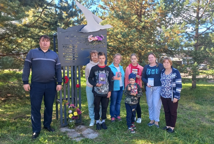 В Степурине возлагаем цветы в память о поэте, коротко рассказываю о планах Комиссии, о недавно вышедшем 3-м выпуске альманаха «Неизбывный вертоград» (о нём подробнее – позже), об изданиях Союза писателей России и издательства «Вече», выпущенных в поддержку наших воинов, участвующих в освободительном походе Русской армии в Новороссии. Дарим некоторые из этих книг степуринцам. В частности, антологию «ПоZыVной – Победа!», книгу «Герои Донбасса и СВО». Я вручаю два своих новых сборника – «На жгучих полях Новороссии» и «На ослепительном снегу». Евгений от себя добавляет ещё двухтомник поэта Юрия Кузнецова, и двухтомник ныне живущего замечательного поэта Юрия Могутина.
