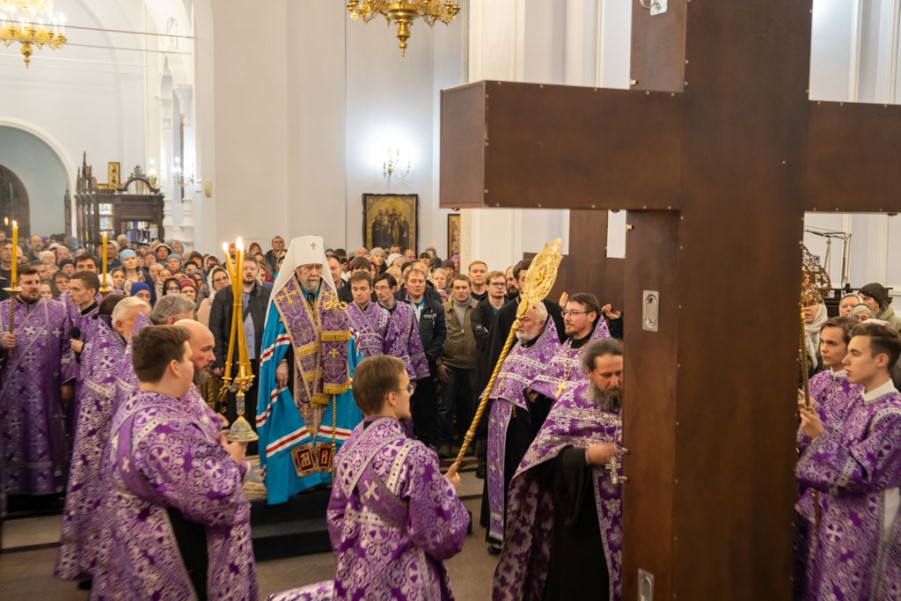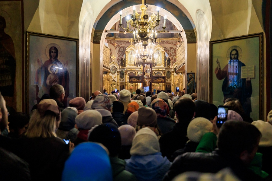Освященную копию Годеновского креста выставили для молитвенного поклонения верующих в центре собора. После славления и поклонения Кресту Господню началось всенощное бдение, которое возглавил митрополит Владимир.