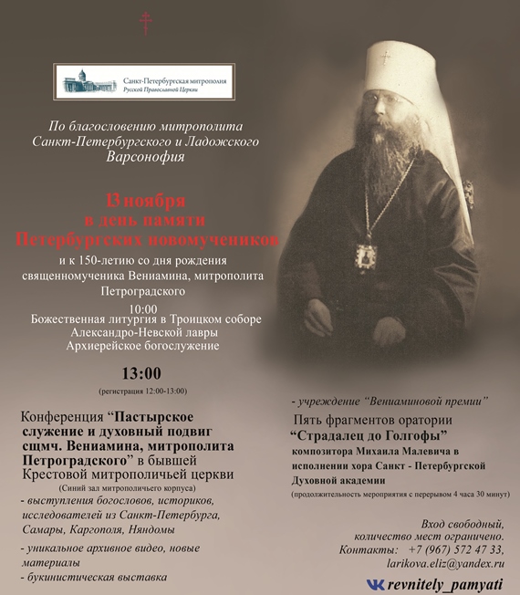 Организаторы конференции — Санкт-Петербургская духовная академия и Сообщество ревнителей памяти сщмч. Вениамина приглашают интересующихся историей Петербурга, историей Русской Церкви и подвига новомучеников и всех, кому дорого имя святого Петроградского митрополита Вениамина 13 ноября в 13.00. Вход свободный.
