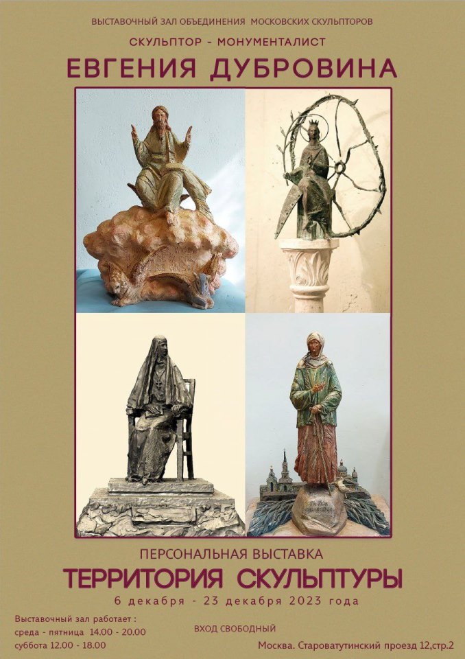 Новая выставка известного московского скульптора Евгении Дубровиной под названием «Территория скульптуры » откроется в залах Обьединения московских скульпторов и будет показана зрителям с 6 по 23 декабря 2023 года.