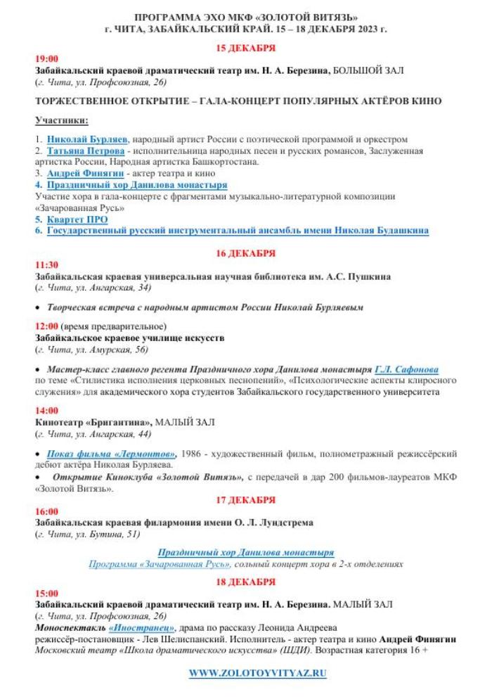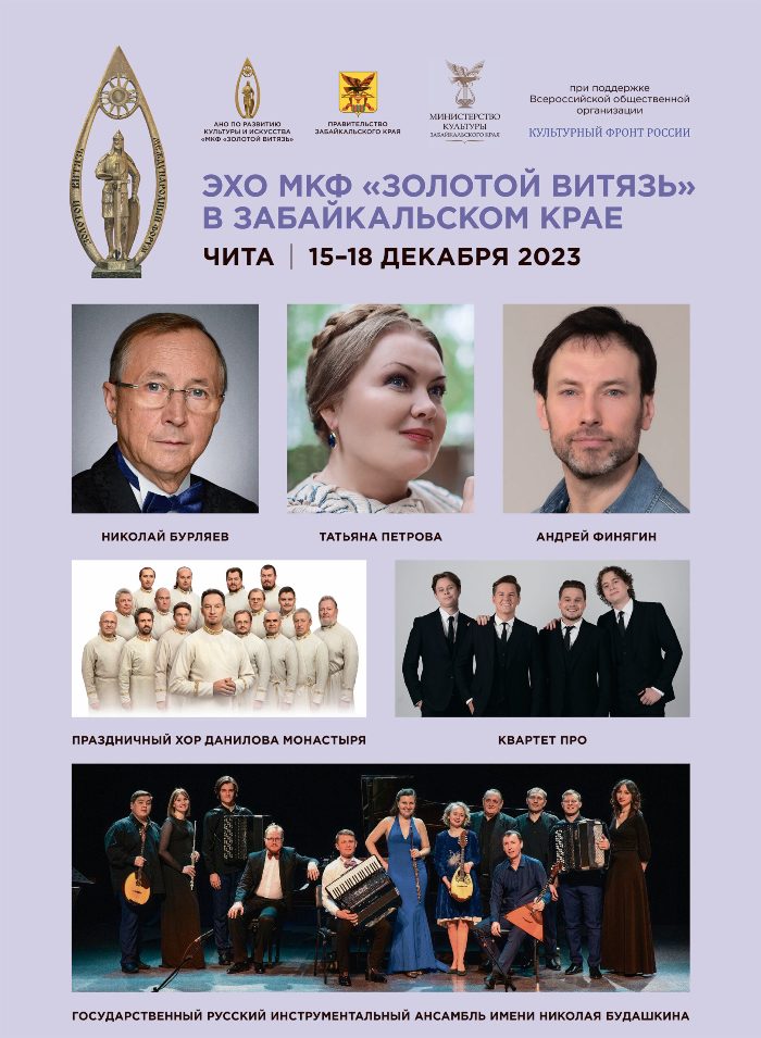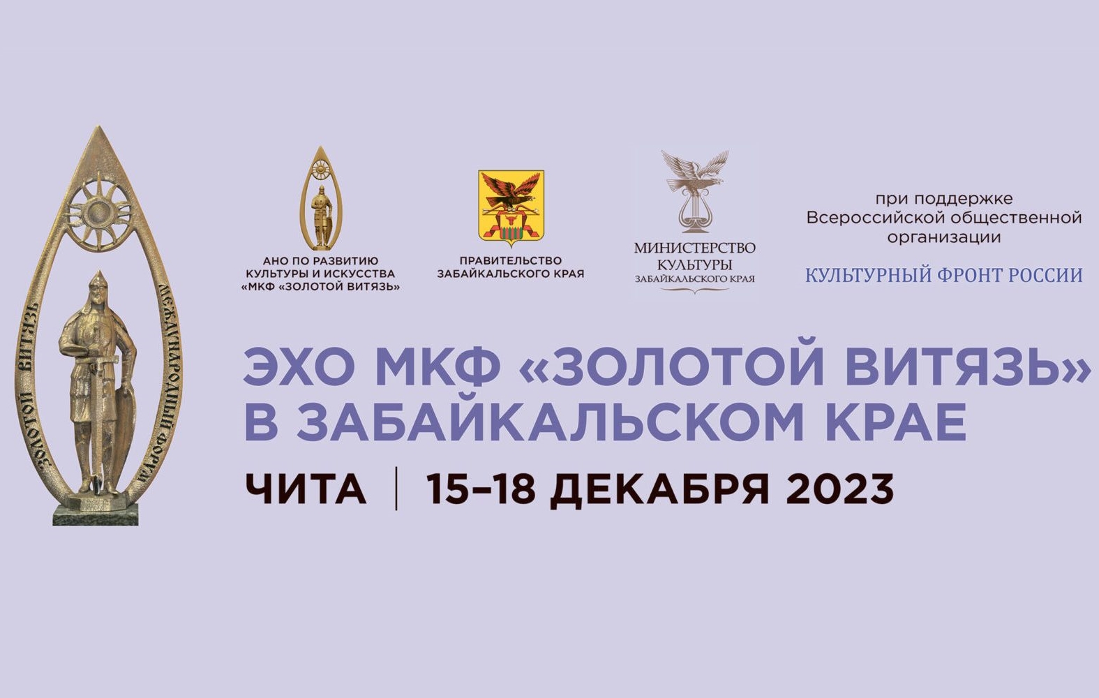 С 15 по 18 декабря 2023 года в г. Чите МКФ «Золотой Витязь» совместно с Правительством и Министерством культуры Забайкальского края при поддержке Всероссийского общественного Движения «Культурный Фронт России», Регионального отделения Культурного Фронта России в Забайкальском крае, проводят Фестиваль «Эхо МКФ "Золотой Витязь" в Забайкальском крае», сообщается в пресс-релизе, поступившем в редакцию «Русской народной линии».