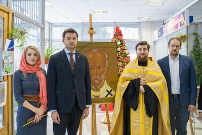 Икона выполнена известным московским мастером Антоном Старцевым. Икону внесли – иконописец Антон Старцев и жертвователь – глава международной организации «Русский Госпиталь» Виталий Хизниченко. Она была освящена настоятелем храма священником Илией Тягиным. Молитвенное настроение охватило всех приглашённых, согласно пели молебен Николаю Чудотворцу, вторя отцу настоятелю, после молебна почувствовали умиротворение и духовную радость.