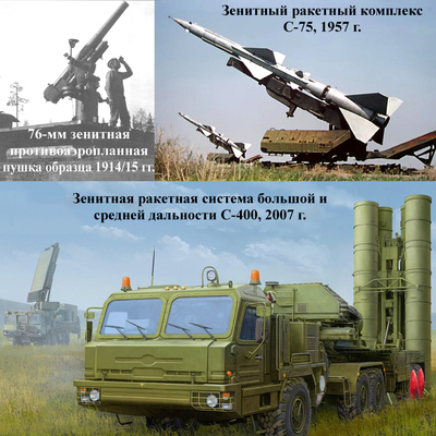 Параллельно шло развитие и войсковой ПВО, которая сейчас включает ПВО Сухопутных, Воздушно-десантных войск и береговых войск Военно-Морского Флота. На смену зенитно-ракетным комплексам первых поколений (С-25, С-75, С-125, С-200) пришли современные ЗРК с различной дальностью боевого применения: дальнего действия (С-300 и С-400 – самый эффективный ЗРК в мире, дальность поражения – до 400 км.), средней дальности – до 100 км (семейство ЗРК «Бук»), малой дальности – до 30 км (семейство ЗРК «Тор»), ближнего действия – до 10 км (семейства ЗРК «Оса», «Стрела» и зенитного ракетно-пушечного комплекса «Панцирь»), переносные зенитно-ракетные комплексы – дальность до 5 км (семейства «Верба», «Игла», «Стрела»), зенитные самоходные артиллерийские установки (до – 3 км) и пулемёты разных типов.