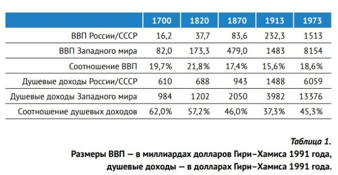 Так, например, с 1600 по 1913 год доля России в населении Земли выросла с 3,7% до 8,7% (здесь и в трёх следующих сравнениях Россия рассматривается в имперских границах 1913 года, а Запад — в границах современной Западной Европы, Северной Америки и Австралии), то есть почти в два с половиной раза, в то время как доля «коллективного Запада» только с 13,3% до 20,8%, всего в полтора раза. И это — несмотря на заселение западными людьми суперпродуктивных восточных и центральных Штатов! За этот же период подушевой ВВП в России увеличился менее чем втрое, с 552 до 1488 долларов (условные доллары Гири–Хамиса 1991 года, данные из сборника А.Мэдиссон «Контуры мировой экономики в 1–2030 гг.»), в то время как душевые доходы обитателей Западной цивилизации увеличились почти впятеро, с 870 до 3986 долларов.