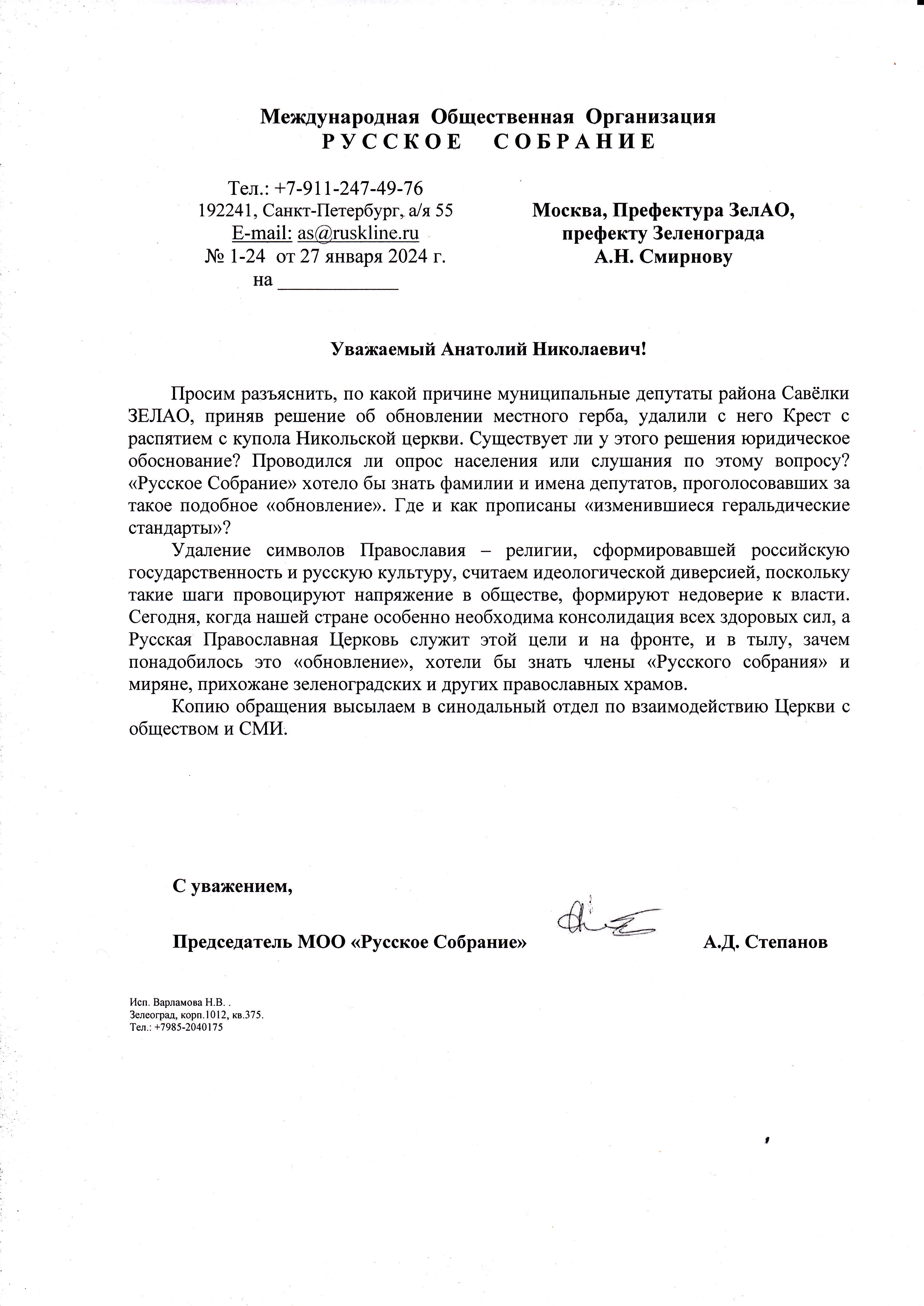 В связи с этим Русское Собрание 27 января обратилось к префекту Зеленоградского АО Москвы с просьбой ответить на следующие вопросы: почему, приняв решение об обновлении муниципального герба, депутаты района Савёлки удалили с изображения православный Крест; проводились ли по этому вопросу слушания или опрос населения; где и как прописаны «изменившиеся геральдические стандарты»?