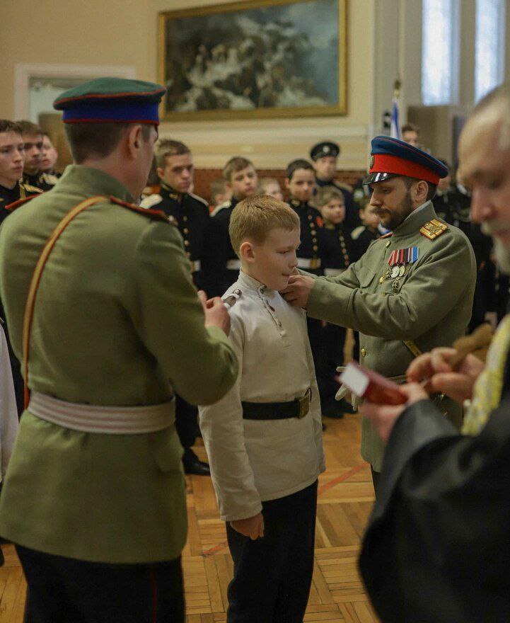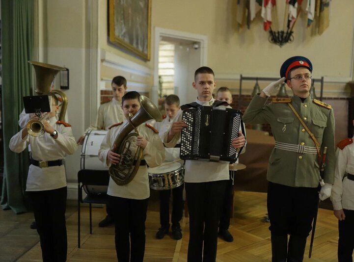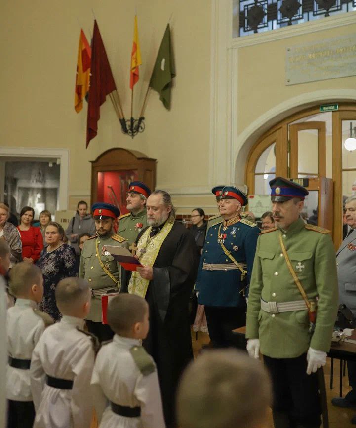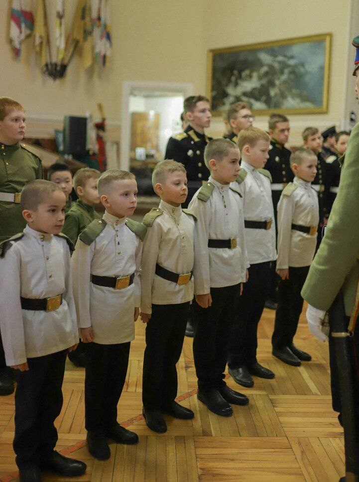 Оркестр Первого кадетского корпуса исполнил старинный гимн «Коль славен». Шестеро новых воспитанников корпуса дали торжественное обещание кадета и получили долгожданные кадетские погоны.