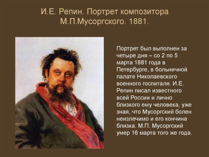 Единственный прижизненный портрет Мусоргского был написан его другом, знаменитым художником Репиным, прямо в больнице, где прошли последние дни композитора. Закончив портрет, Репин оставил его там, но спустя девять дней Модест Петрович скончался.