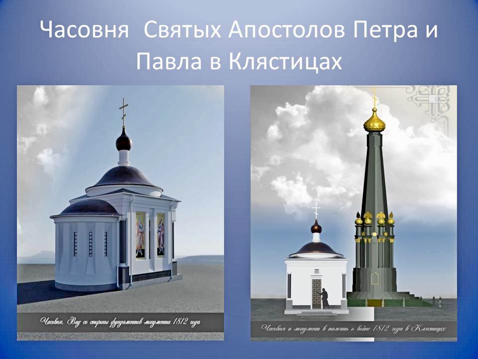 Также в Клястицах местные жители верят, что придёт время восстановить утраченный монумент, посвящённый войне 1812 года, созданный по проекту Антонио Адамини, который был поставленн в 1857 году, но при советской власти, в 1939 г., монумент снесли. Также «Мастак-сервис» разработал проект, чтобы вместе с часовней, посвящённой апостолам Петру и Павлу, стоял воссозданный монумент в честь победы 1812 года. Именно в 1912 году комплекс храма и монумента существовал как единый ансамбль памяти павших солдат и офицеров войны 1812 года.
