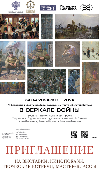 24 апреля 2024 года в 17.00 в Галерее Беляево Объединения «Выставочные залы Москвы» (улица Профсоюзная, 100, м. «Беляево») в рамках ХV Славянского форума изобразительных искусств «Золотой витязь» при поддержке Министерства культуры Российской Федерации, Общероссийского общественного движения «Культурный Фронт России», открывается военно-патриотический арт-проект «В зеркале войны», включающий в себя: