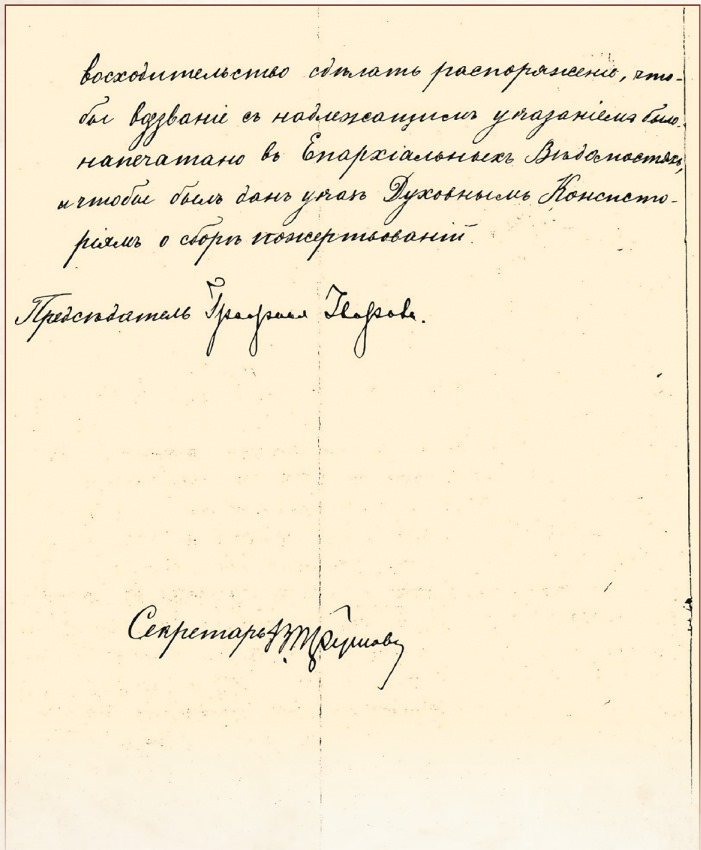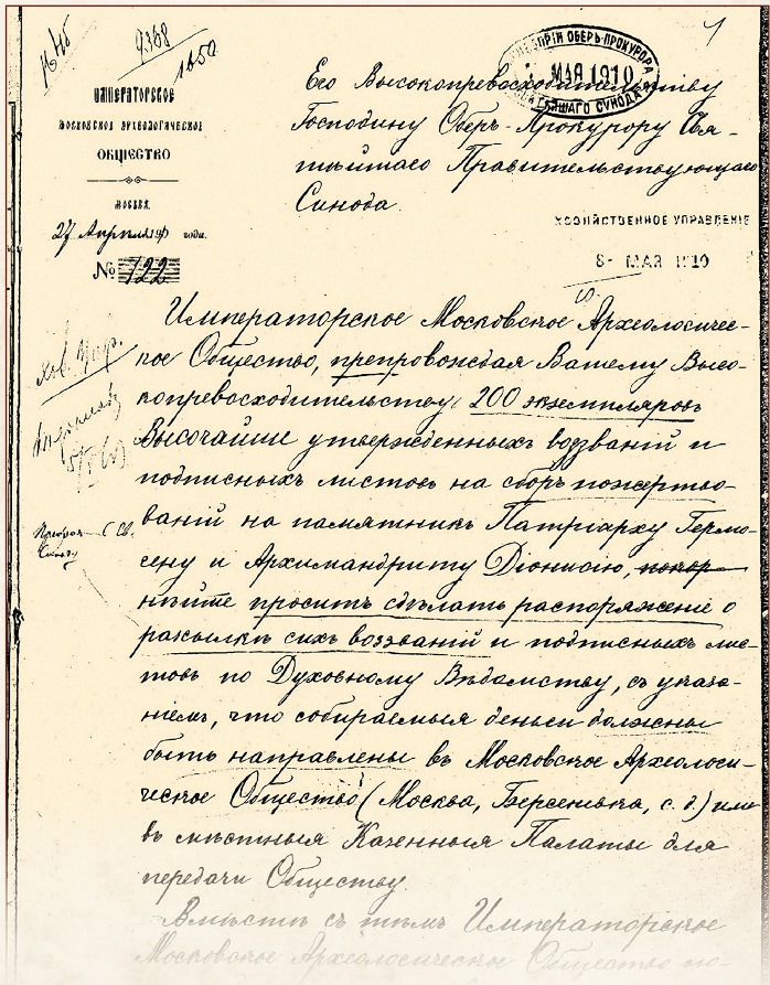 Обращение графини Прасковьи Уваровой от имени Московского археологического общества в Правительствующий Синод, 1910