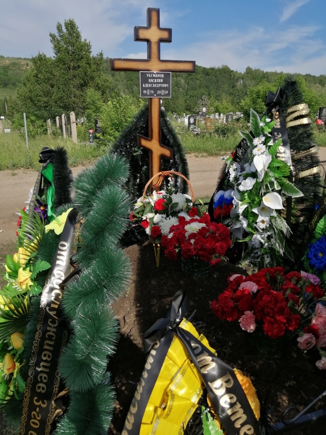 Похоронили Василия на новом кладбище в Муллино, на юго-западе Октябрьского, где уже появилась воинская аллея героев СВО. Перед погребением военком города вручил вдове Татьяне посмертную награду Василия — орден Мужества. Под звуки гимна России гроб предали земле. А вокруг могильного холма, покрытого живыми цветами, образовалось море венков.