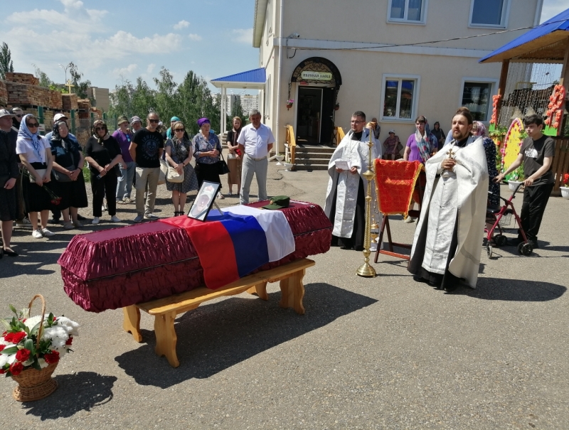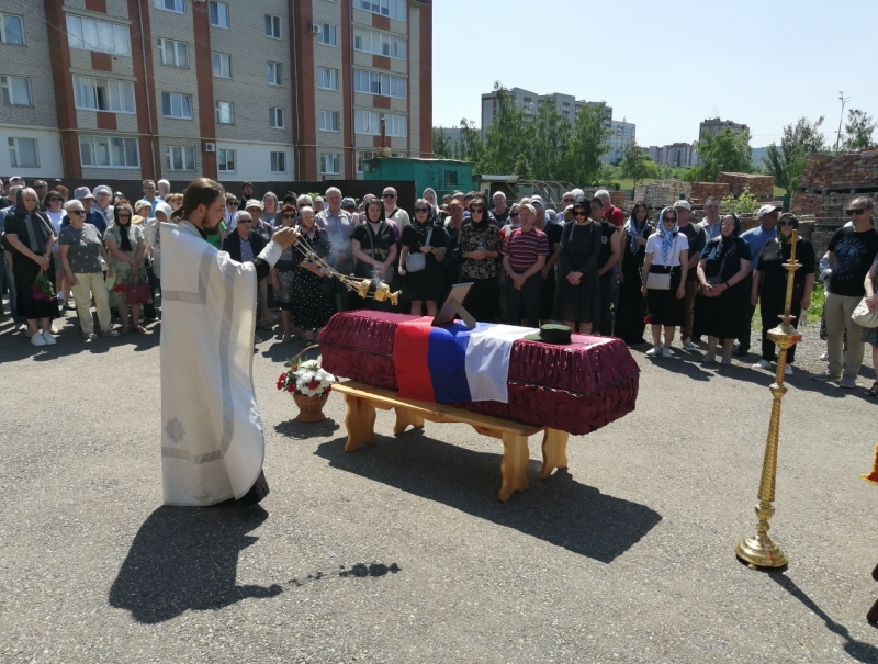 Еще через десять дней, 11 июня, состоялись многолюдные похороны воина Василия Рахманова в родном Октябрьском. Небольшая Троице-Сергиевская церковь не смогла бы вместить всех желающих проститься с воином-земляком, поэтому цинковый гроб, покрытый Российским флагом, поставили во дворе храма. Отпевали раба Божия Василия два священника: отец Артемий Климин и отец Павел Чмыхалов. В октябре 2022 года, незадолго до отправки на СВО, Василий исповедовался и причащался в этом храме. А перед самым отъездом отец Павел молитвенно напутствовал и благословил мобилизованных. Получил тогда благословение на ратное служение и воин Василий. После отпевания старший священник храма отец Артемий искренне и просто сказал важные слова о христианском подвиге наших павших воинов, таких как Василий, ибо сказано в Евангелии: «Нет больше той любви, как если кто положит душу свою за друзей своих» (Ин.15:13).
