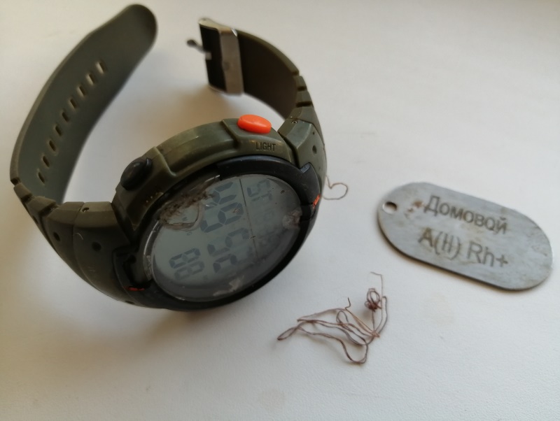 Накануне дня похорон родителям Василия в военкомате передали его личные вещи: военный билет, нательный крест, воинский жетон и наручные часы. Все эти вещи находились в обычном полиэтиленовом пакете, куда были сложены, вероятнее всего, в госпитале. С особым внутренним трепетом я вынимал их, рассматривал и фотографировал. Небольшой серебряный нательный крест с распятием сильно потемнел. На воинском жетоне с гравировками позывного «Домовой» и группой крови — следы запекшийся крови. На наручных электронных часах разбита часть стекла, и осколки попали внутрь, на циферблат, но часы ходят. В поврежденном стекле — застывшая кровь. А в складках ремешка застряли нитки окровавленного бинта…