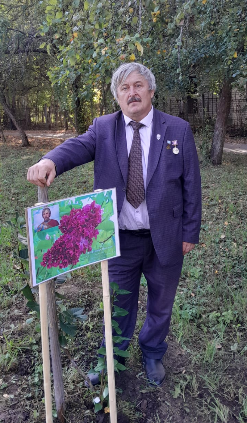 Руководитель Ленинградского областного отделения Александро-Невского братства Николай Иевлев у сирени «Александр Невский»