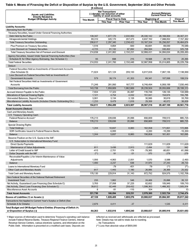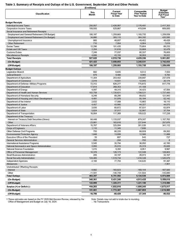 Прогноз федерального казначейства США (министерства финансов) на конец 2024 фискального года (на дату 30 сентября 2024 года) был следующим – доходы – 5,081 триллиона долларов (факт – 4,919 триллиона долларов), расходы – 6,940 триллионов долларов (факт – 6,752 триллиона долларов), дефицит бюджета на конец финансового года – 1,859-триллионов долларов (факт – 1,833 триллиона долларов).